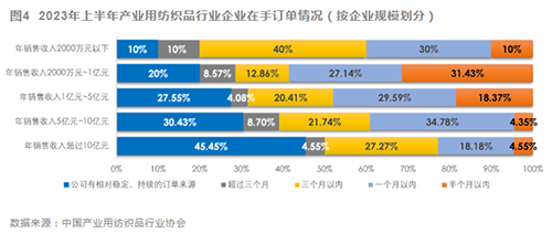 企業在手訂單方面,32.2%的受訪企業擁有相對穩定、持續的訂單來源或在手訂單能夠支持三個月以上的生產,而28.3%的受訪企業在手訂單僅能夠支撐企業一個月以內的生產。根據企業規模,大企業的在手訂單更加穩定、充足,能夠支持更長時間的生產;而中小企業的在手訂單大多只能夠支撐一個月以內甚至半個月以內的生產(圖4)。