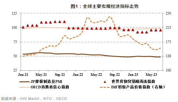 2023年上半年,全球經濟在服務業穩定復蘇、國際供應鏈恢復通暢以及通貨膨脹水平逐步回落支撐下維持低速增長,但主要經濟體央行持續加息對經濟復蘇的負面影響持續顯現,消費端復蘇依舊乏力,制造業及商品貿易景氣低迷。全球制造業景氣指數連續11個月處于收縮區間,7月J.P. Morgan制造業采購經理指數(PMI)為48.7,其中新出口訂單指數僅為46.3,均降至今年以來新低;美國、德國、日本制造業PMI全部處于緊縮區間。經合組織(OECD)消費者信心指數回升至98.5,但仍連續第24個月低于榮枯線。世界貿易組織(WTO)5月發布的全球貨物貿易晴雨表指數為95.6,低于100趨勢水平。國際大宗商品價格持續回落,7月國際貨幣基金組織(IMF)初級產品價格指數為158.7,較上年同期大幅下降69.7個百分點。