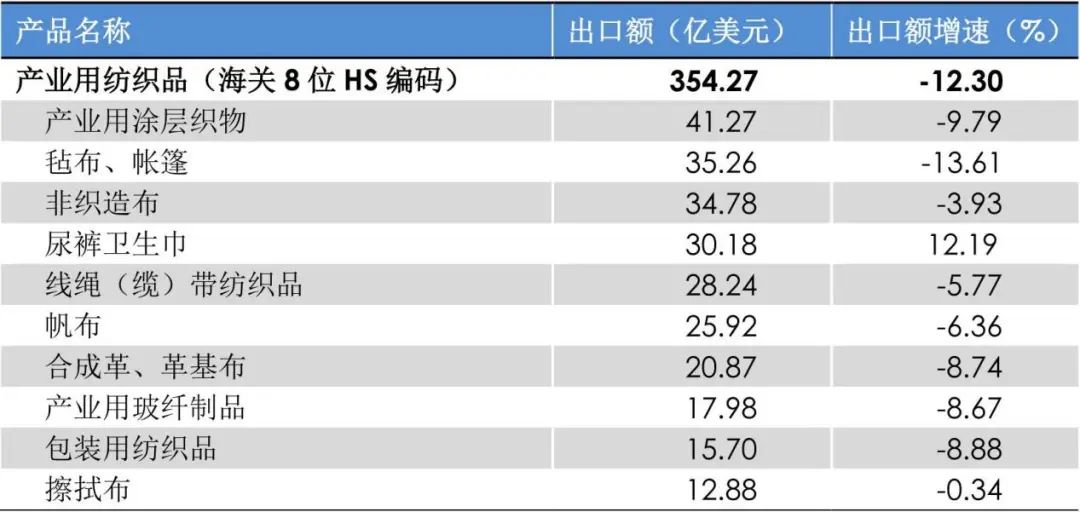 國際貿易方面,根據中國海關數據,2023年1-11月我國產業用紡織品行業的出口額(海關8位HS編碼統計數據)為354.3億美元,同比下降12.3%;1-11月行業進口額(海關8位HS編碼統計數據)為48億美元,同比下降15.2%。分產品來看,產業用涂層織物、氈布/帳篷是目前行業的兩大出口產品,產業用涂層織物的出口額突破40億美元,達到41.3億美元,氈布/帳篷的出口額為35.3億美元,同比下降13.6%;非織造布的海外需求持續回暖,出口量為119.6萬噸,同比增長8.3%,出口額為34.8億美元,隨著出口單價的回升,非織造布的出口額降幅收窄至3.9%;一次性衛生用品(尿褲、衛生巾等)海外市場保持活躍,出口額達到30.2億美元,同比增長12.2%;傳統產品中,革基布、產業用玻纖制品、包裝用紡織品的出口額降幅有所收窄,線繩(纜)帶紡織品、帆布的出口額降幅有不同程度的加深;擦拭布(不含濕巾)的出口額為12.9億美元,同比下降0.3%。