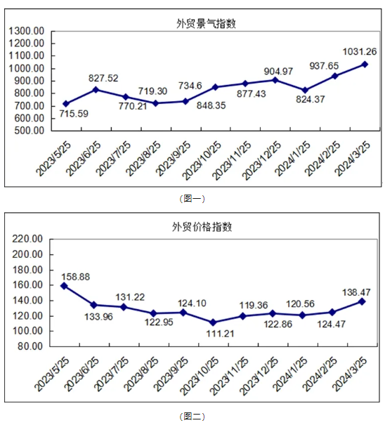 如圖1、圖2所示,2024年3月份外貿(mào)景氣指數(shù)收于1031.26點,環(huán)比上漲9.98%;外貿(mào)價格指數(shù)收于138.47點,環(huán)比上漲11.25%;外貿(mào)信心指數(shù)收于930.17點,環(huán)比下跌9.39%。