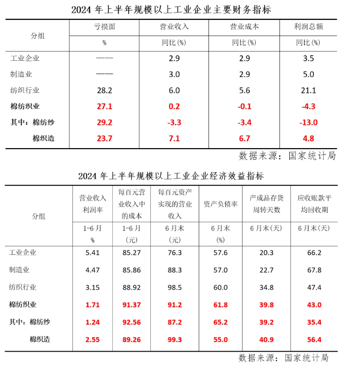 上半年數(shù)據(jù)顯示,與規(guī)上工業(yè)、制造業(yè)和紡織行業(yè)相比,規(guī)上棉紡織業(yè)營收增速明顯偏弱,利潤增速呈現(xiàn)背離同比下降,資產(chǎn)負債率處于更高水平,產(chǎn)成品庫存壓力更大,上半年棉紡織經(jīng)濟運行承壓明顯。