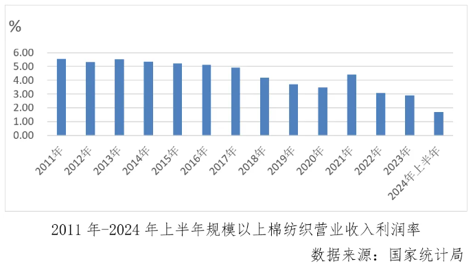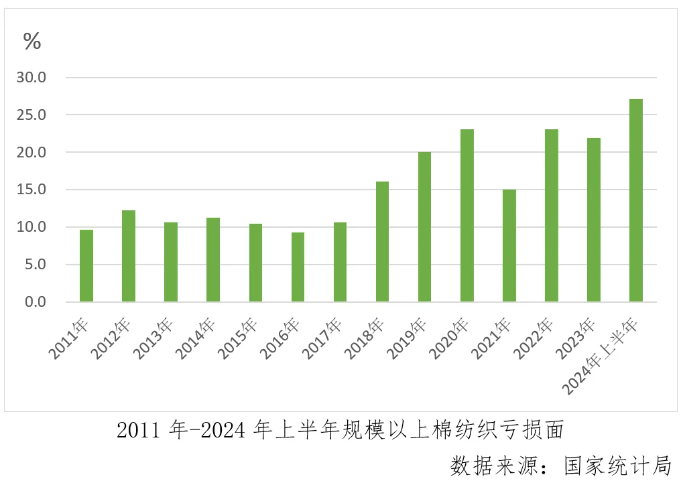 上半年,規(guī)上棉紡織業(yè)營業(yè)收入利潤率為1.71%,與此前年度相比,為規(guī)模以上工業(yè)企業(yè)起點標(biāo)準(zhǔn)從年營收500萬元提高到2000萬元的2011年以來最低點,營收利潤率繼2022年和2023年分別創(chuàng)下新低后,今年上半年繼續(xù)向下尋底。上半年規(guī)上棉紡織業(yè)27.1%的虧損面亦為2011年以來新高,營收利潤率和虧損面兩項關(guān)鍵比率指標(biāo)在上半年均陷入近十幾年來最低迷水平。