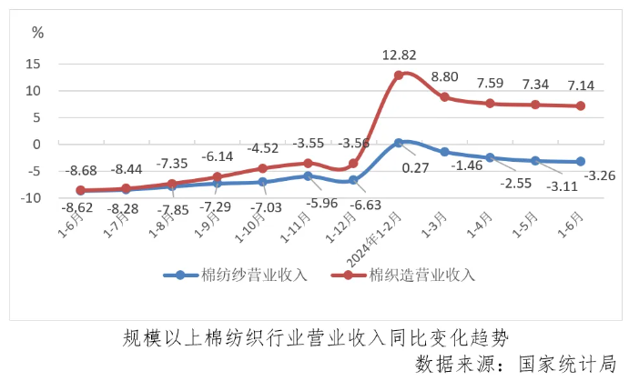 據(jù)國家統(tǒng)計局數(shù)據(jù),上半年,規(guī)上棉紡紗營業(yè)收入同比下降3.26%,降幅比1-5月份擴大0.15個百分點,規(guī)上棉織造營業(yè)收入同比增加7.14%,增速比1-5月份放緩0.20個百分點。上半年,棉紡紗營收增速持續(xù)為負,棉織造營收增速連續(xù)放緩。