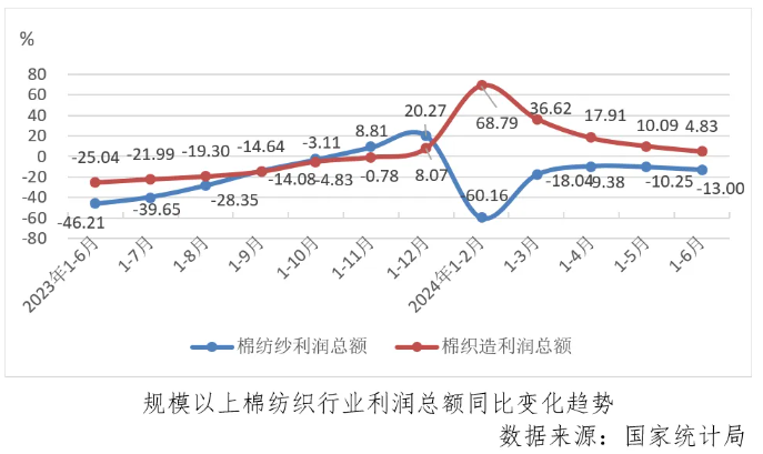 據(jù)國家統(tǒng)計局數(shù)據(jù),上半年,規(guī)上棉紡紗利潤同比下降13.00%,降幅比1-5月份擴大2.75個百分點,棉織造利潤同比增長4.83%,比1-5月份增速放緩5.26個百分點,棉紡紗和棉織造利潤同比增速持續(xù)分化。