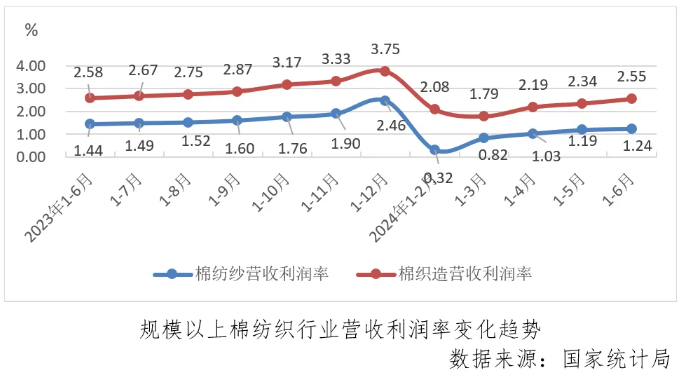 據(jù)中國棉紡織行業(yè)協(xié)會跟蹤的重點企業(yè)(以下簡稱“重點企業(yè)”)數(shù)據(jù),上半年,營業(yè)收入同比下降1.67%,降幅比1-5月份擴大1.55個百分點,利潤總額同比下降26.12%,降幅比1-5月份擴大2.43個百分點,虧損面為33.33%,比1-5月份擴大1.92個百分點,營業(yè)收入利潤率為3.06%,比1-5月份擴大0.15個百分點。“重點企業(yè)”的虧損面處于高位且有所擴大,營收和利潤累計同比雙降,且降幅加深,利潤率稍有提升。整體看,“重點企業(yè)”利潤率好于統(tǒng)計局規(guī)上企業(yè),但營收、利潤同比情況和虧損面指標(biāo)不容樂觀。