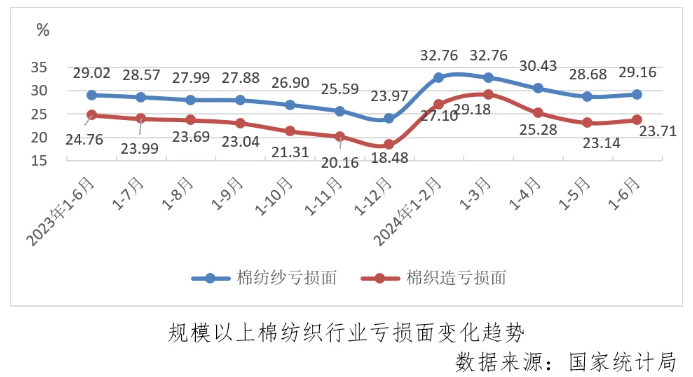 上半年,棉紡紗和棉織造的虧損面分別為29.16%和23.71%,分別比1-5月份擴大0.48和0.57個百分點。
