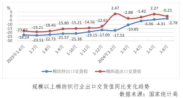 據(jù)國家統(tǒng)計局數(shù)據(jù),上半年,規(guī)上棉紡紗出口交貨值(以人民幣計)下降2.78%,較1-5月份降幅收窄1.53個百分點。規(guī)上棉織造出口交貨值(以人民幣計)同比下降0.25%,較1-5月份增速由正轉(zhuǎn)負。上半年棉紡紗和棉織造產(chǎn)品出口額同比均為負增長,與全國紡織品服裝出口增速正向增長相背離。