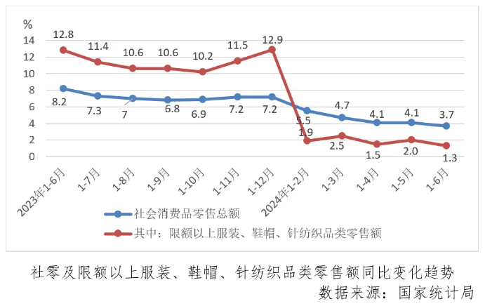 6月份,社會消費品零售總額40732億元,同比增長2.0%,上半年,社會消費品零售總額235969億元,同比增長3.7%。其中限額以上服裝、鞋帽、針紡織品類6月份同比下降1.9%,上半年同比上漲1.3%,弱于社會消費品零售總額。