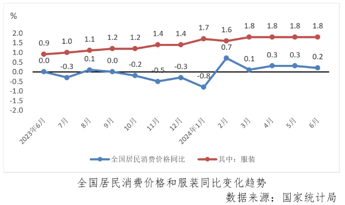6月份,全國居民消費價格同比上漲0.2%,環(huán)比下降0.2%,其中服裝同比上漲1.8%,環(huán)比下降0.2%。上半年平均,全國居民消費價格同比上漲0.1%,其中服裝同比上漲1.7%。