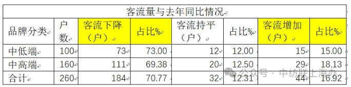 1,從客流量情況來看,走訪的商家中大部分都反饋今年的客流量與去年同比是下降的,這個比例占到70.77%。僅有16.92%的商家反饋客流量有所增加。在去年的調(diào)查中,我們得到的信息是當(dāng)時客流有所恢復(fù),但還沒有恢復(fù)到疫情前,這主要是因為當(dāng)時疫情管控剛放開,客流比疫情管控中增加是正常現(xiàn)象。但就目前的情況來看,現(xiàn)在商場中光顧實體服裝店的人氣已更不如從前,且已經(jīng)形成一種趨勢。