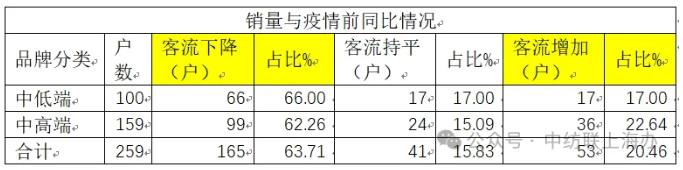 2,從銷售情況來看,受訪的商家反饋的經(jīng)營狀態(tài)與客流情況基本一致。有63.71%的商家反饋今年的銷售與去年同比是下降的。僅有20.46%的商家反饋銷售同比有所增加。