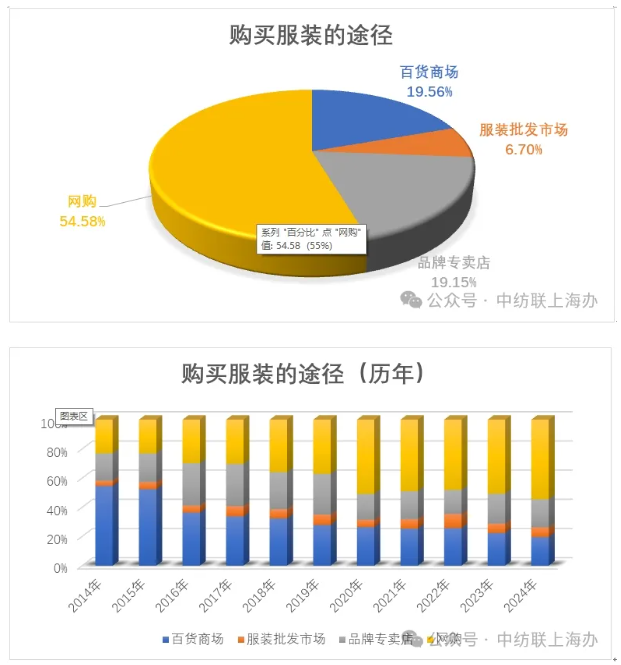 有54.58%的受訪者表示主要是通過網(wǎng)購來購買服裝,這一比例比去年調(diào)查時又增加了3.85個百分點。隨著年歲的增長,伴隨著互聯(lián)網(wǎng)成長起來的一代人已經(jīng)成為消費的主力軍,網(wǎng)購的便利性已經(jīng)使其滲入到各個消費領(lǐng)域。在我們歷年對服裝消費的調(diào)查中,網(wǎng)購的比例從10年前的23.11%到現(xiàn)在已經(jīng)增長了31.47個百分點。而同時,去百貨公司購買服裝的比例則從10年前的54.58%下降到了現(xiàn)在的19.56%,下降了35.02個百分點。這說明,10年來人們在服裝的消費渠道上發(fā)生了根本的改變,百貨公司已經(jīng)不適應(yīng)人們的消費習(xí)慣,這也印證了我們對商場的調(diào)查中客流量連年下降的現(xiàn)象。但在這十年中,去品牌專賣店購買服裝的比例卻是相對穩(wěn)定的,一直維持在20%左右,今年的比例是19.15%。這說明對于高端的服裝消費來說,還是注重于消費體驗,而且習(xí)慣于這種消費的人群相對穩(wěn)定。