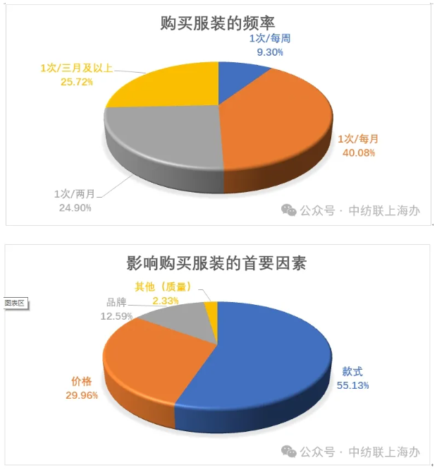 大多數(shù)人購買服裝的頻率是一到三個月消費一次。在受訪者中,每月消費一次的人群比例占到40.08%,每二個月消費一次的比例占到24.90%,每三個月消費一次的比例占到25.72%。對于影響消費者購買服裝的首要因素,大多數(shù)人選擇了款式,這一比例占到55.13%,其次是價格,這一比例占到29.96%。