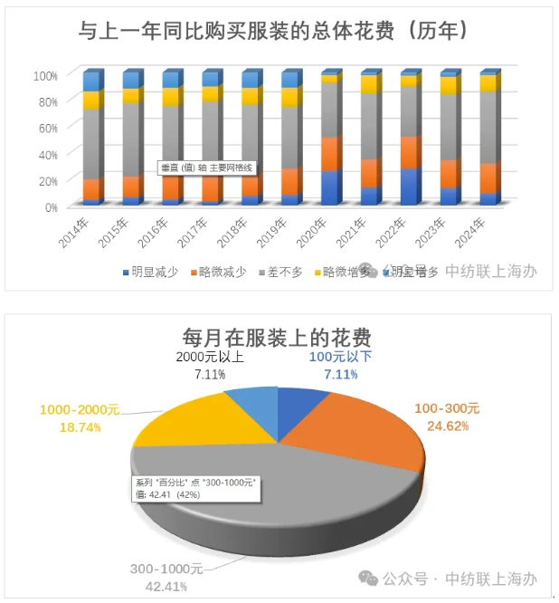受訪的消費者中有31.46%的人表示在服裝上的總體消費是減少了的,僅有14.36%的受訪者表示消費在增加,另有54.17%的受訪者表示在服裝上的消費和去年是差不多的。對于每個月用在服裝上的花費,大多數(shù)受訪者選擇了在300-1000元之間,這一比例占到42.41%,其次是100-300元之間,這一比例是24.62%。從近幾年的調(diào)查數(shù)據(jù)來看,大家在消費能力上的變化并不是太大,但是疫情對消費的信心是有較大影響的,特別是在今年,這種影響逐漸顯現(xiàn)。從調(diào)查數(shù)據(jù)看,大家對經(jīng)濟走勢持悲觀或很悲觀觀點的人的占比為33.24%,比去年的調(diào)查數(shù)據(jù)增加了3.62個百分點,持樂觀和很樂觀觀點的人的占比為36.66%,比去年的調(diào)查數(shù)據(jù)減少了4.2個百分點。對于后續(xù)在服裝上的消費預(yù)算,有25.17%的受訪者表示會減少,這一數(shù)據(jù)與去年基本持平,僅有9.17%的受訪者表示會增加,這一數(shù)據(jù)比去年減少了2.36個百分點。