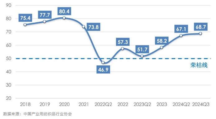 2024年前三季度,全球經(jīng)濟(jì)增長勢頭強(qiáng)勁,但通貨膨脹壓力、貿(mào)易緊張局勢和投資環(huán)境趨緊等問題依然存在;我國經(jīng)濟(jì)運(yùn)行總體穩(wěn)中有進(jìn),高質(zhì)量發(fā)展扎實(shí)推進(jìn),向好因素累積增多。我國產(chǎn)業(yè)用紡織品行業(yè)經(jīng)濟(jì)運(yùn)行呈恢復(fù)性增長態(tài)勢,市場需求持續(xù)復(fù)蘇,行業(yè)出口整體處于回暖區(qū)間。根據(jù)協(xié)會調(diào)研,2024年前三季度我國產(chǎn)業(yè)用紡織品行業(yè)景氣指數(shù)為68.7,較上半年提升1.6個(gè)百分點(diǎn)(圖1)。