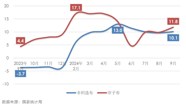 自2024年以來,非織造布的產(chǎn)量回升勢頭良好,根據(jù)國家統(tǒng)計(jì)局?jǐn)?shù)據(jù),2024年1-9月規(guī)模以上企業(yè)的非織造布產(chǎn)量同比增長10.1%,月均產(chǎn)量較上半年繼續(xù)提升。隨著乘用車市場逐步回暖,簾子布的生產(chǎn)在經(jīng)歷了上半年的波動(dòng)后重回兩位數(shù)增長,1-9月規(guī)模以上企業(yè)的簾子布產(chǎn)量同比增長11.8%(圖2)。