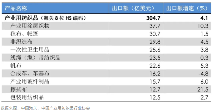 表2 2024年1-9月產(chǎn)業(yè)用紡織品行業(yè)及主要產(chǎn)品出口情況