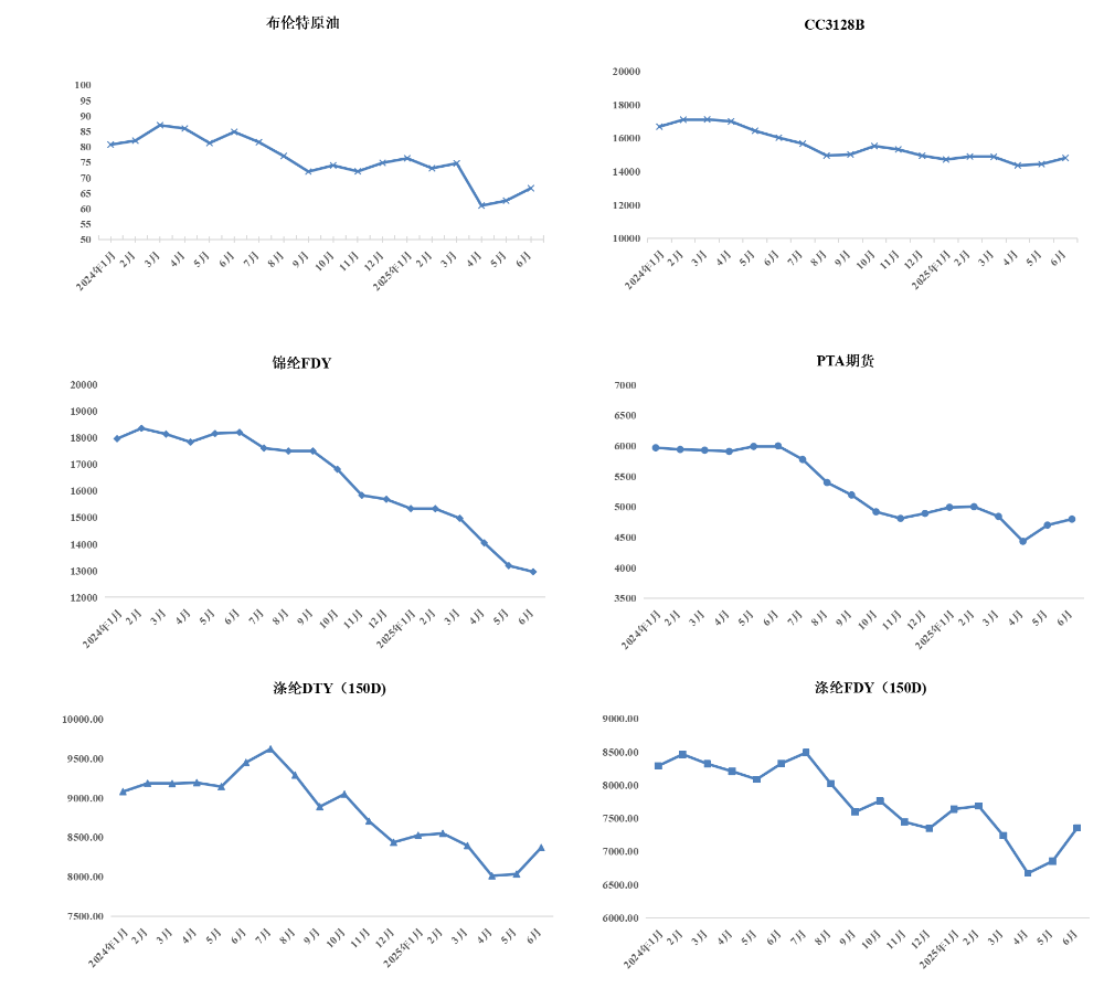 圖1 2024年1月~2025年6月我國化纖長絲、棉花、PTA期貨及布倫特原油價格走勢