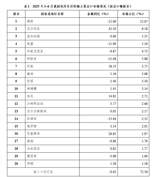 2025年1~6月,我國化纖長絲織物累計出口額超過1億美元的單一市場有25個,主要出口市場中出口額排名前二十的國家和地區累計出口份額占我國長絲織物出口總額的72.6%。