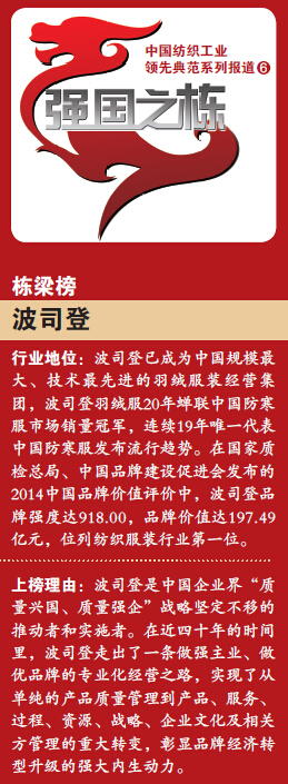 本刊記者-黃天玉 吳昕潞 在勞動力等剛性成本上漲,國際品牌進入,互聯網新消費模式沖擊等重重挑戰下,中國紡織服裝行業正在告別從前,勢必要不斷加快結構調整,提升品牌建設、科技研發、運行管理等方面的能力。經過激烈角逐,在今天的全球競爭中,以波司登股份有限公司為代表的一批中國服裝企業已經逐步成熟起來,品牌形象和產業鏈整合都在向高端邁進。 作為中國最耳熟能詳的服裝企業之一,波司登品牌及其董事長高德康的創業故事無數次被人們提起。波司登從上世紀70年代開始創業,成為勇于革新的“弄潮兒”和先行者。而在“十二五”的轉型大潮中,波司登仍以求變的意識和創新的思維,敏銳地捕捉行業新風向,從多個維度展現了棟梁企業的強國印象。