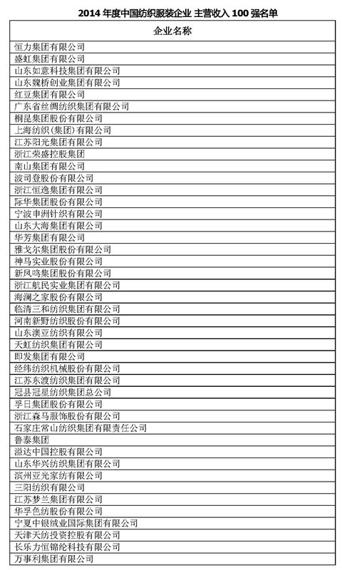 近期,中國紡織工業聯合會統計中心正式發布了“2014-2015年度中國紡織服裝企業競爭力500強”名單和“2014年度中國紡織服裝行業主營業務收入100強企業”名單。山東如意、山東魏橋、恒力等500家企業榮登行業500強榜單,恒力、盛虹、如意等100家企業榮登行業主營業務收入100強榜單。