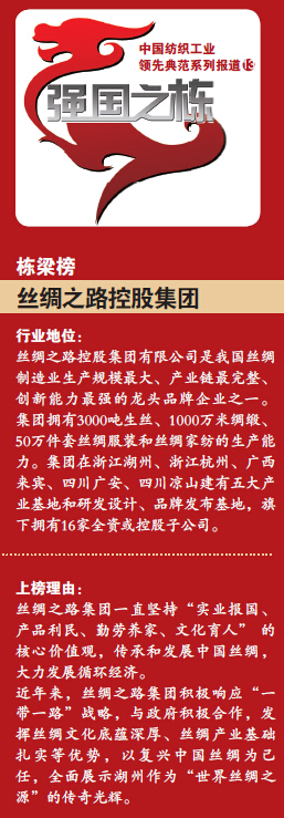 如今的絲綢之路集團(tuán),員工勞動(dòng)合同續(xù)簽率達(dá)100%;五險(xiǎn)一金的勞動(dòng)保障福利達(dá)100%;連續(xù)十多年間,不論企業(yè)效益好壞,員工工資收入保持年增長(zhǎng)12%~15%。絲綢之路集團(tuán)還擁有多個(gè)“第一”:湖州市同行業(yè)中第一個(gè)建立全員住房公積金制度,幫助無(wú)數(shù)員工住上了自己買的房子;第一個(gè)建立員工幫困基金,幫助無(wú)數(shù)病窮交加的員工脫離困境;第一個(gè)建立企業(yè)學(xué)校和各種企業(yè)文化教育設(shè)施,讓員工伴隨企業(yè)一起成長(zhǎng);第一個(gè)建立員工短信平臺(tái),使企業(yè)任何一級(jí)管理層乃至董事長(zhǎng)與員工的信息交流暢通無(wú)阻。 凌蘭芳把一個(gè)弱勢(shì)群體做成了一個(gè)強(qiáng)勢(shì)企業(yè)。“實(shí)業(yè)報(bào)國(guó),產(chǎn)品利民,勤勞養(yǎng)家,文化育人”的核心價(jià)值觀,將絲綢之路集團(tuán)2000多位員工凝聚在一起,投身于發(fā)展現(xiàn)代絲綢產(chǎn)業(yè),弘揚(yáng)民族絲綢文化。但凌蘭芳仍不無(wú)傷感地說(shuō),現(xiàn)在的年輕一代都不愿意從事絲綢業(yè)。這么一點(diǎn)點(diǎn)絲綢骨血不保存下來(lái),湖州就要遠(yuǎn)離絲綢,就不再是“絲綢之府”了,“大家都不做絲綢,我們還堅(jiān)持做絲綢,這就是出路。” 生于動(dòng)蕩,走過(guò)深淵,經(jīng)過(guò)十多年發(fā)展,絲綢之路集團(tuán)在湖州,在浙江,在中國(guó)站穩(wěn)了腳跟,繅絲、織綢、真絲服裝、真絲織錦、真絲家紡等各類絲綢產(chǎn)品構(gòu)成了完整系列,受到國(guó)內(nèi)外客商喜愛(ài),每年有5億多元人民幣的絲綢產(chǎn)品銷往世界各地。靠著堅(jiān)韌的毅力和精準(zhǔn)的市場(chǎng)策略,又得益于政府對(duì)民族工業(yè)的扶持,絲綢之路集團(tuán)快速發(fā)展成長(zhǎng)為中國(guó)絲綢制造業(yè)的龍頭企業(yè)之一。對(duì)外,是愛(ài)馬仕等國(guó)際頂級(jí)奢侈品牌的絲綢供應(yīng)商;對(duì)內(nèi),在廣西發(fā)展桑蠶基地5萬(wàn)畝,為2000多戶蠶農(nóng)增加收入;在四川廣安設(shè)立工業(yè)園區(qū),解決近5000人就業(yè)。 “十二五”的開(kāi)局之年,絲綢之路集團(tuán)就實(shí)現(xiàn)銷售收入20.5億元,利稅6000多萬(wàn)元,僅家紡即實(shí)現(xiàn)銷售3400萬(wàn)元,利潤(rùn)貢獻(xiàn)率接近30%,形成了種桑養(yǎng)蠶到繅絲織綢再到終端產(chǎn)品的完整產(chǎn)業(yè)鏈。“十二五”期間,絲綢之路集團(tuán)成功地從一個(gè)傳統(tǒng)制造型企業(yè)變身為擁有自主研發(fā)、自主營(yíng)銷、自主品牌的先進(jìn)制造型的現(xiàn)代大企業(yè),并使先進(jìn)制造業(yè)與現(xiàn)代服務(wù)業(yè)緊密結(jié)合,最終實(shí)現(xiàn)了凌蘭芳心中“繅絲自動(dòng)化、織造數(shù)碼化、服裝品牌化、家紡國(guó)際化”的目標(biāo),絲綢之路集團(tuán)也成為振興中國(guó)百年遺產(chǎn)工業(yè)的中堅(jiān)力量。