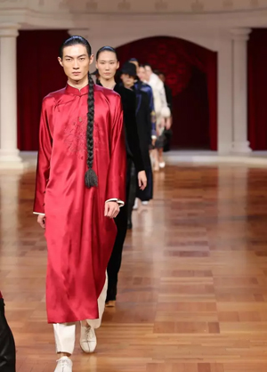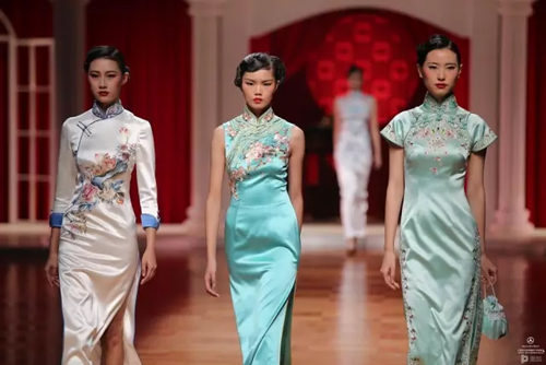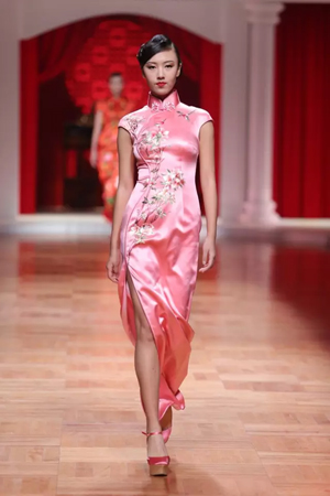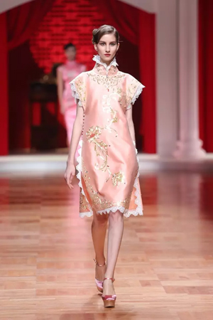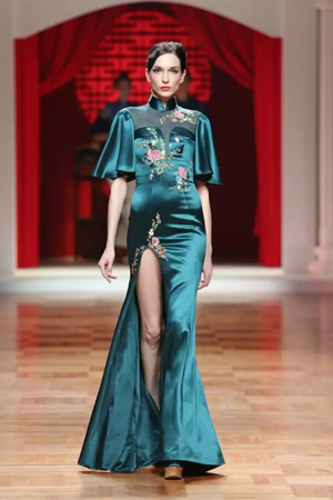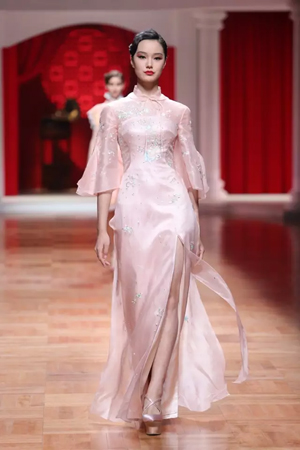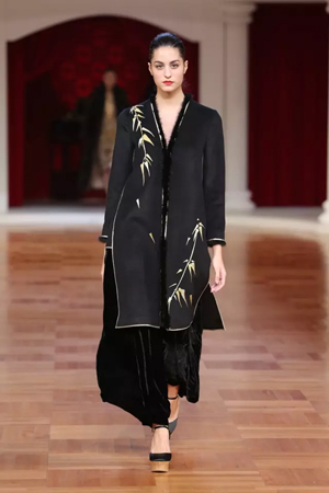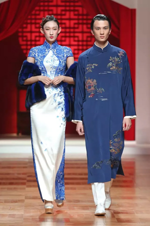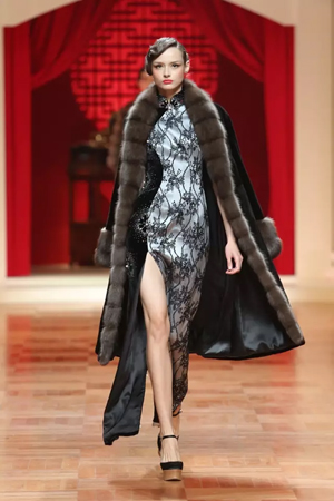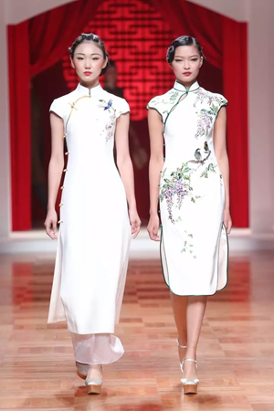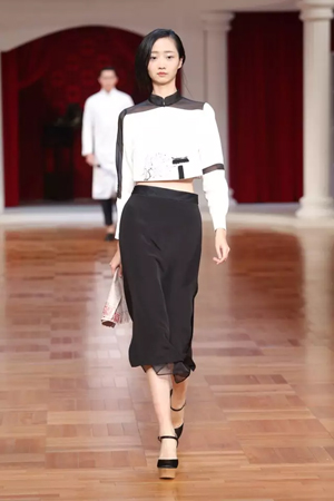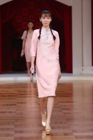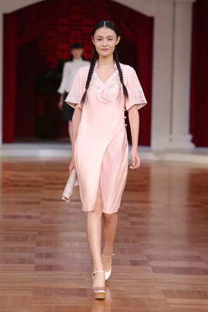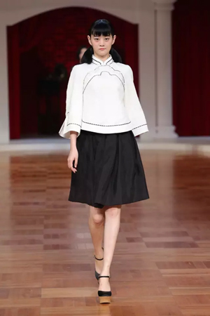 這一系列作品結合西式立體剪裁技術,改變了傳統的平直造型,色彩也更為淡雅,以黑、白、灰、粉為主基調,點綴水藍、湖綠、朱紅。