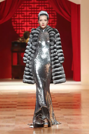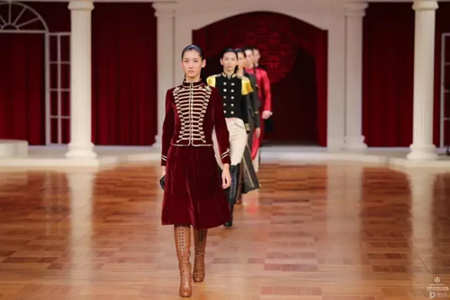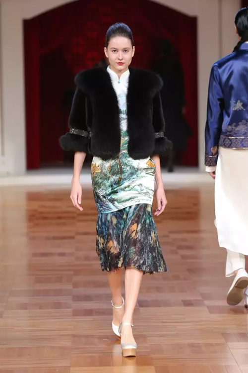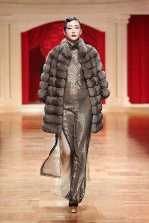 北洋軍閥時期的華麗軍裝形制簡便,精致洋裝充滿活力,清末貴族裘皮服飾再度重現傳統風姿,一場服飾變革席卷而來。細節方面絲毫不馬虎,中國傳統蘇繡、勾邊刺繡、米珠刺繡等技藝運用于絲絨、真絲重緞、毛呢等面料之上。 第二幕,五四運動,民族覺醒。