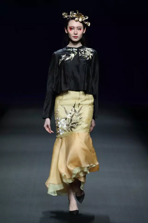 本次亮相的50余套服裝以陽光、大地、河流為主題,體現(xiàn)天人合一、萬物欣榮的東方美學文化意境。陽光系列,在香云紗面料上融合植物圖案,金色手工刺繡,展現(xiàn)了光照人間、萬物生長的景象;大地系列,用深沉的色調(diào)表達蒼天厚土的大氣,用靚麗的色系,表達大地的鳥語花香;河流系列,用飄柔感和淺色系,詮釋水鄉(xiāng)的靈動、生活的婉約、優(yōu)雅與禪意。