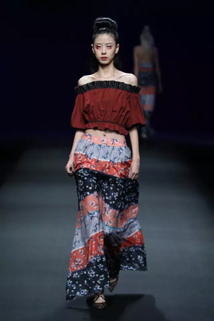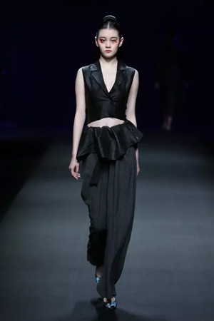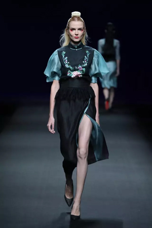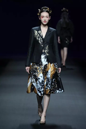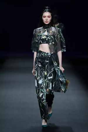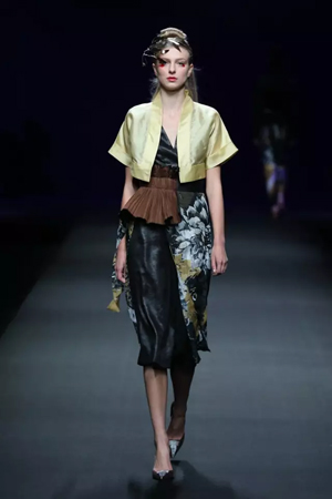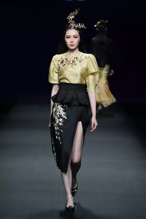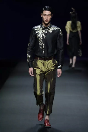 黑色與金色面料,一些漢服元素,時尚的流行色點綴,讓“國家級非物質(zhì)文化遺產(chǎn)”香云紗綻放在T臺;豹紋褲和波西米亞花裙增添了活力,特別讓人印象深刻的是滿臺精致的苗繡,竹葉和花蝶,配著靛藍、赭石、棗紅、石青的布料,隔多遠都能感受到繡工的樸質(zhì)精美;更不用說滿場流動的那香云紗的質(zhì)感:沉沉的分量,只屬于絲綢的閃爍光芒,好品位的代表。金憓給香云紗帶來了時尚感和年輕的活力。