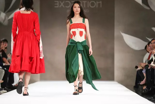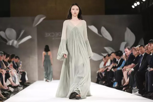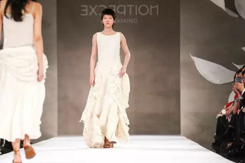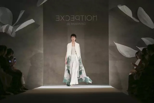 例外(EXCEPTION de MIXMIND)、方所(Fang Suo Commune)、YMOYNOT、衡山·和集The Mix Place創(chuàng)始人毛繼鴻致辭。 例外二十年來對原創(chuàng)設(shè)計的表達,對非遺手工藝傳承以及其所承載的當代東方精神,通過現(xiàn)場文化、藝術(shù)、設(shè)計等話題的交流得以彰顯。 動靜皆宜 共享例外之夜 例外之夜光影交疊,徐徐晚風分外清爽,皎潔荷花靜靜盛放。場內(nèi)的荷花裝置靈感取自宋代詞人陸游的名篇《采蓮曲》,重現(xiàn)蓮池之靜美,白蓮無瑕,藤莖蔓延,觀者如置身于水畔,感知自然。 燈光徐徐落下,隨著節(jié)奏明快的音樂,身穿“清韶”系列的模特踏著靈動的腳步走來,內(nèi)斂精致的氣息撲面而至。系列服飾所呈現(xiàn)的圖案,凝聚了宋代美學中溫潤的顏色和簡美流暢的線條結(jié)構(gòu)。 自蓓蕾到開花,再到盛放,抑或宋畫中的筆墨濃淡,結(jié)合飄逸順滑的面料和雅致的色調(diào),突顯溫潤端莊的氣質(zhì),使人在繁忙喧囂的夏日都市中感受清新氣息,帶來愉悅感。