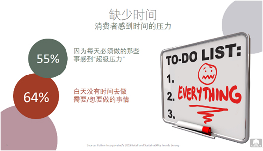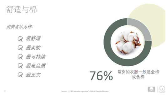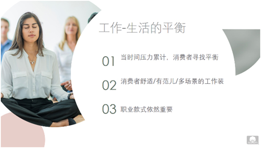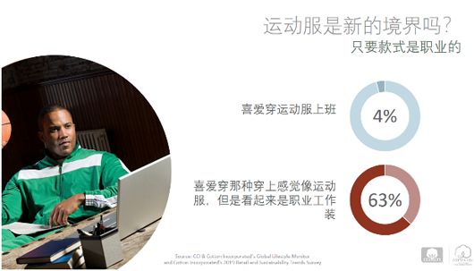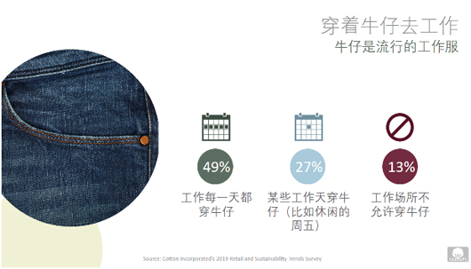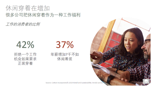 1. 工作與生活平衡 根據美國棉花公司2019零售和可持續趨勢調查,55%的中國消費者表示因為每天必須做的那些事感到“超極壓力”,64%的中國消費者表示白天沒有時間去做需要/想要做的事情。在全球經常感到疲憊不堪的比例高達54%。因此,許多公司為減輕員工壓力,把允許休閑穿著作為一種工作福利。同樣根據前述提到的趨勢調查,42%的中國消費者拒絕一個需要穿著正裝的工作機會。牛仔正變得越來越流行,49%的中國消費者每天都穿著牛仔褲工作,27%允許在某些工作日穿著牛仔(例如周五)。消費者認為,樂于穿著牛仔工作的原因是舒適,多樣性,時尚和功能性。另一個在工作場合受到消費者歡迎的是,職業款式的運動服裝。63%的中國消費者喜愛穿著感覺像運動服裝,但是看起來是職業工作裝。此外,根據美國棉花公司和美國國際棉花協會的全球生活方式調查,76%的中國消費者常穿的服裝一般是全棉或含棉。他們認為棉是最舒適,最柔軟,最可持續和品質最好的。