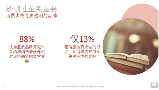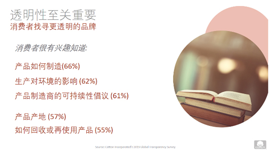 根據美國棉花公司2019全球透明性調查,88%的中國消費者認為服裝品牌開誠布公的和消費者就他們對環境的影響非常重要,僅13%的消費者相信服裝行業做的很好,讓消費者知道品牌對環境的影響。消費者找尋更透明的品牌,消費者很有興趣知道,產品如何制造(66%),生產對環境的影響(62%),產品制造商的可持續倡議(61%),產品產地(57%),如何回收或再使用產品(55%)。關于產品回收,自2006年起,美國棉花公司發起BLUE JEANS GO GREEN?項目,通過該項目收集牛仔布,將其從垃圾填埋場轉移,并與Bonded Logic,Inc.合作,將其回收為UltraTouch?牛仔絕緣材料。每年,這些絕緣材料被分發到美國各地以幫助建筑工作。至今,已經收集了近250萬條牛仔褲,從垃圾填埋場轉移了超過1230噸紡織廢品。