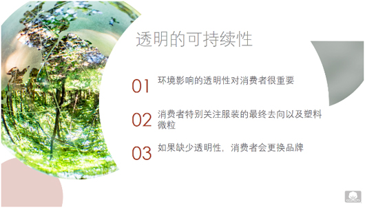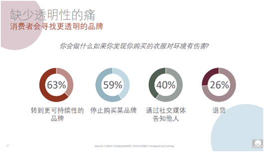 近年來塑料微粒污染是大家熱議的話題,根據2019零售與透明性趨勢調查,38%的中國消費者意識到塑料微粒污染,67%的中國消費者表示會影響自身購買。如果發現購買的衣服對環境有傷害,63%的中國消費者會轉向更可持續的品牌。59%的消費者會停止購買該品牌。40%的消費者會通過社交媒體轉告他人。26%的消費者選擇退貨。因此可見,環境影響的透明性對消費者很重要,消費者特別關注服裝的最終去向和塑料微粒話題的動向。如果品牌缺乏透明性,消費者可能會更換品牌。