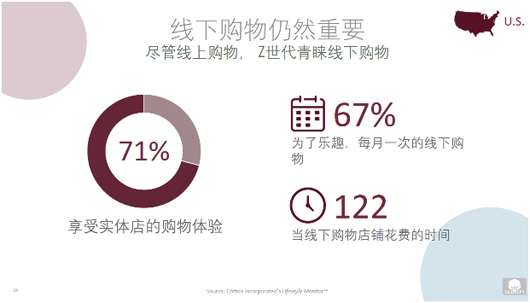 根據歐睿的調查報告,網上服裝消費持續增長,到2018年全球線上服裝銷售達2690億美元。而Z世代絕對是移動的一代,他們基本線上購物。根據美國棉花公司和美國國際棉花協會的全球生活方式調查,中國Z世代消費者愿意使用智能手機做下列:瀏覽(53%),購買(39%),再次購買(56%)。他們也更愿意通過社交媒體獲得著裝理念,更喜歡擁有AI個性化購物體驗的品牌。然而,線下購物對Z世代依然重要。根據美國棉花公司生活方式調查,71%的美國Z世代消費者享受實體店的購物體驗。他們認為線下購買服裝更方便,快捷,享受到品牌提供的客戶服務。