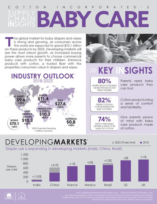 ![]() 全球市場綜述 全球嬰兒尿不濕和濕巾市場走勢強勁且不斷增長。預計到2023年,全球消費者將在這些產品上花費701億美元。發展中國家的市場將出現最強勁的增長。隨著消費者購買力的增強,父母有能力為孩子選擇專業品牌嬰兒護理產品。結合消費者信賴的棉纖維的各項屬性,提高尿不濕和濕巾產品的價值。