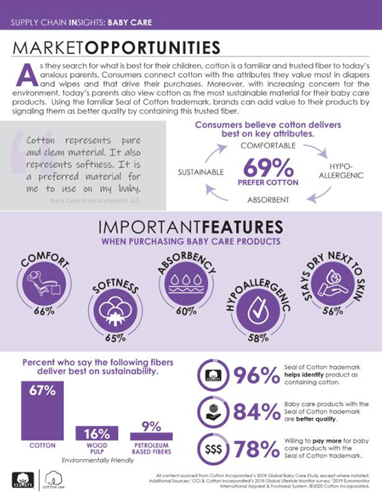 市場機遇 在父母為孩子尋找最好產品的時候,棉是當今焦慮的父母所熟悉和信任的纖維。消費者將棉纖維與他們最看重的尿不濕和濕巾屬性聯系起來,這些屬性推動了他們的購買。此外,隨著人們對環境的日益關注,如今的父母也將棉視為嬰兒護理產品最可持續的材質。在產品上使用消費者熟悉的棉花印標識,品牌可以增加其產品的價值,突出其為含有令人信賴棉纖維,質量更佳的產品。