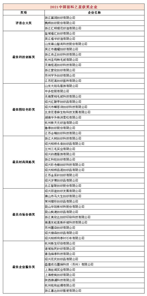 本刊記者-夏小云 關云鶴 2021年10月9日,2021中國面料之星系列活動發布儀式在“2021中國國際紡織面料及輔料(秋冬)博覽會”隆重舉行,最佳企業服務獎、最具時尚風格獎、最佳科技創新獎、最佳圖紋色彩獎、最具市場價值獎、評委會大獎共計6項大獎正式揭曉。