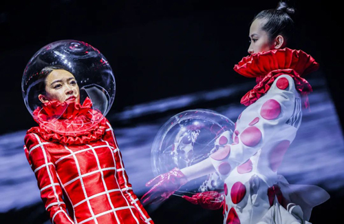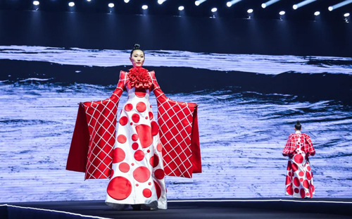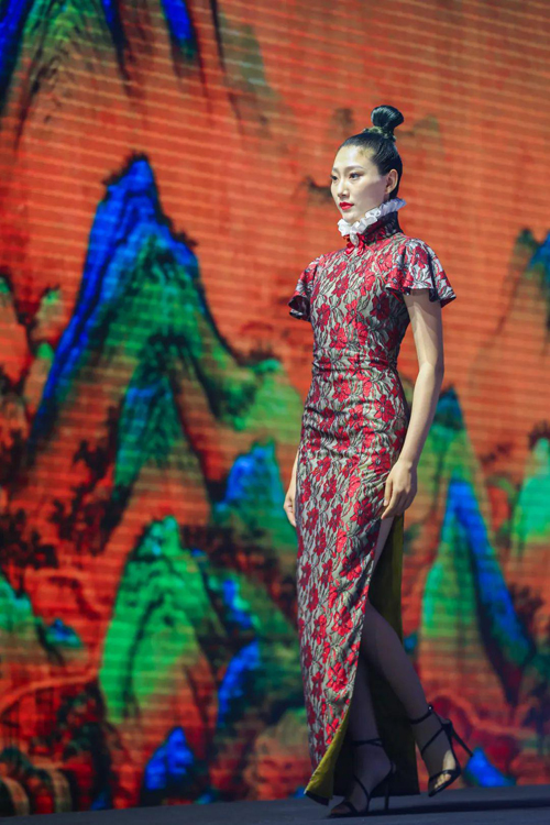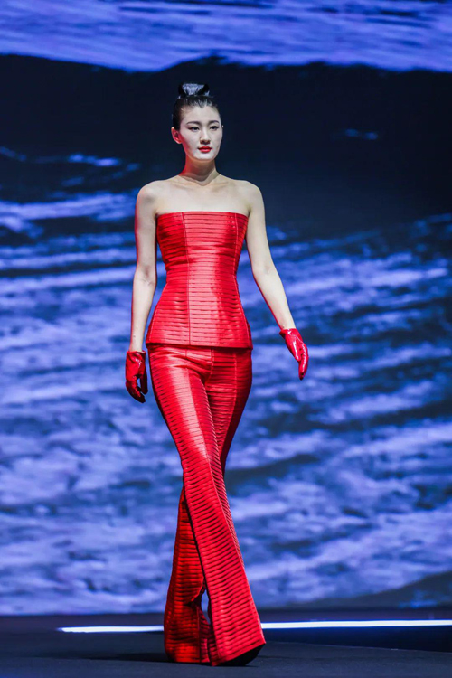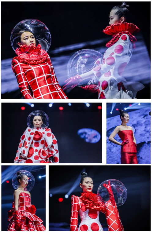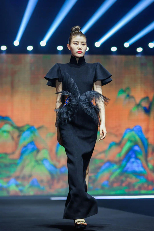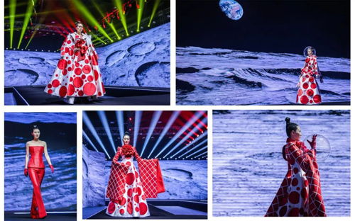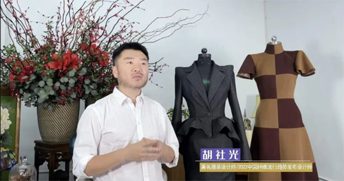本次跨界大秀胡社光親自構思設計主題定制服裝,設計過程中緊密結合發布會主題、兩大篇章八大類流行纖維的內涵外延,盡顯纖維之美、纖維之魅。在纖?自然本源篇大秀中,我們看到身穿東方傳統服飾的少女,從巍巍青山中徐徐走來,無處不彰顯著自然之美,非遺漢繡老繡片與高定服裝的完美結合,更使悠悠纖絲貫穿古今,奔向未來。在纖?蝶變新生篇大秀中,胡社光以未來宇宙為主題——織-天宮,以“無界與共行”為設計理念,以同色系的撞色拼接設計更彰顯了一種簡約卻又富有層次的時尚之美、夢幻之美。