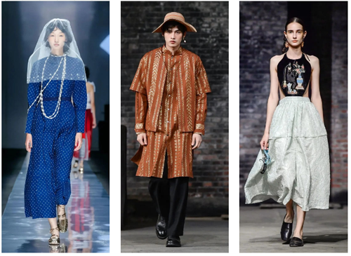 本季時裝周上,中國美學、非遺創新成為多數品牌首選基調。眾多設計獎良渚文化、三星堆文化、五行文化、山海經、古典詩詞、古典戲劇、書法繪畫等進行了藝術化、潮流化融合創新表達。本季涉及的非遺工藝包括京繡、蘇繡、絲綾堆繡、潮繡、打籽繡、苗繡、緙絲、香云紗等數十種非遺工藝,展現出與現代潮流、生活方式接軌的新風貌。