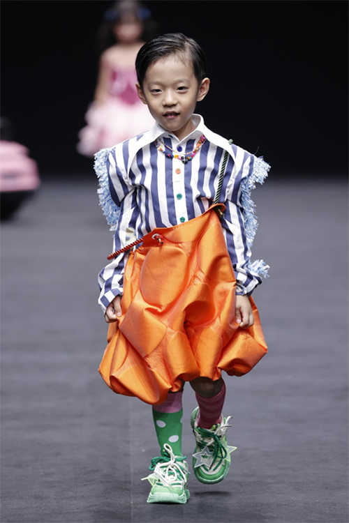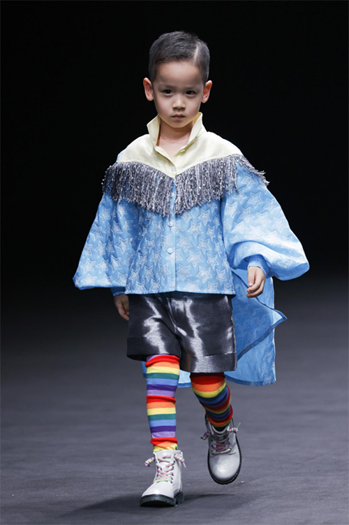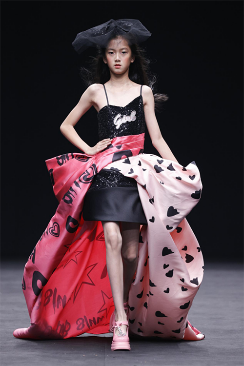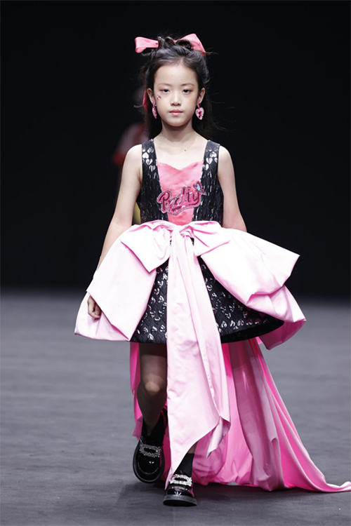 ![]() ![]() ![]() ![]() ![]() Beautyberrykids比以往更添趣味,童模張嚴(yán)之一襲拼色粉禮服開場。芭比粉的玩具汽車和小狗的出場營造了一個等比例縮小的成人世界。童裝分割線的游動銜接內(nèi)在結(jié)構(gòu)的變化,層次錯位、拼或撞的色塊和面料,加上芭比氛圍的BLINGBLING、夸張字母印花都讓禮服增強(qiáng)了成衣效果。范子?jì)汕纹さ亩膛钊沽料啵Y(jié)與桃心亮片搭配的視覺沖擊將當(dāng)下兒童的心理狀態(tài),以更寫實(shí)的方式推向主觀能動的定位上去,引導(dǎo)成人逐漸尊重孩子的意愿和想法。