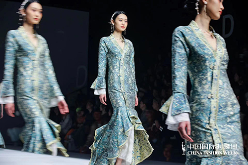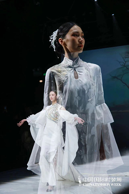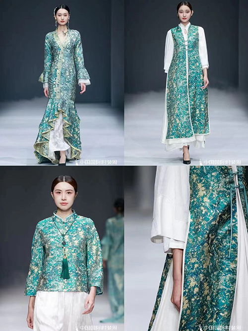 本季發(fā)布根據新時代生活方式需求,打造國風禮服與國風成衣不同穿著體驗。面料采用全真絲織錦、真絲綃、醋酸緞、水溶刺繡蕾絲、提花絲麻等面料,結合手工緙絲、刺繡、盤扣、織錦、印金、植物染等各項非遺工藝。結合現代藝術與零碳環(huán)保理念,融合中國傳統(tǒng)文化印記與風格進行設計再創(chuàng),重新定義新國風服飾的潮流風向。