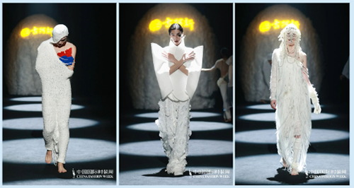 ![]() ![]() 秀場上,從不規則裁剪開始,一針一線,通過掐捏折皺、手工珠串編織、扭花流蘇等設計手法,傳遞手作與織物的聯接。在面料肌理的塑上運用了結構重組、立體印繡等手法。賦予穿著者新的體感,用服裝語言演繹劇場多面的表達。
