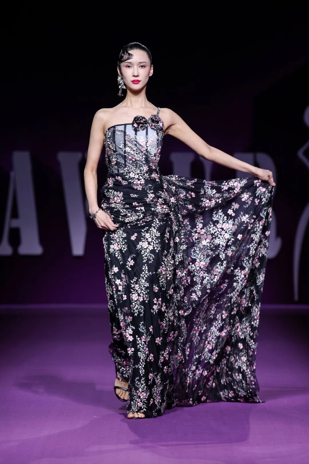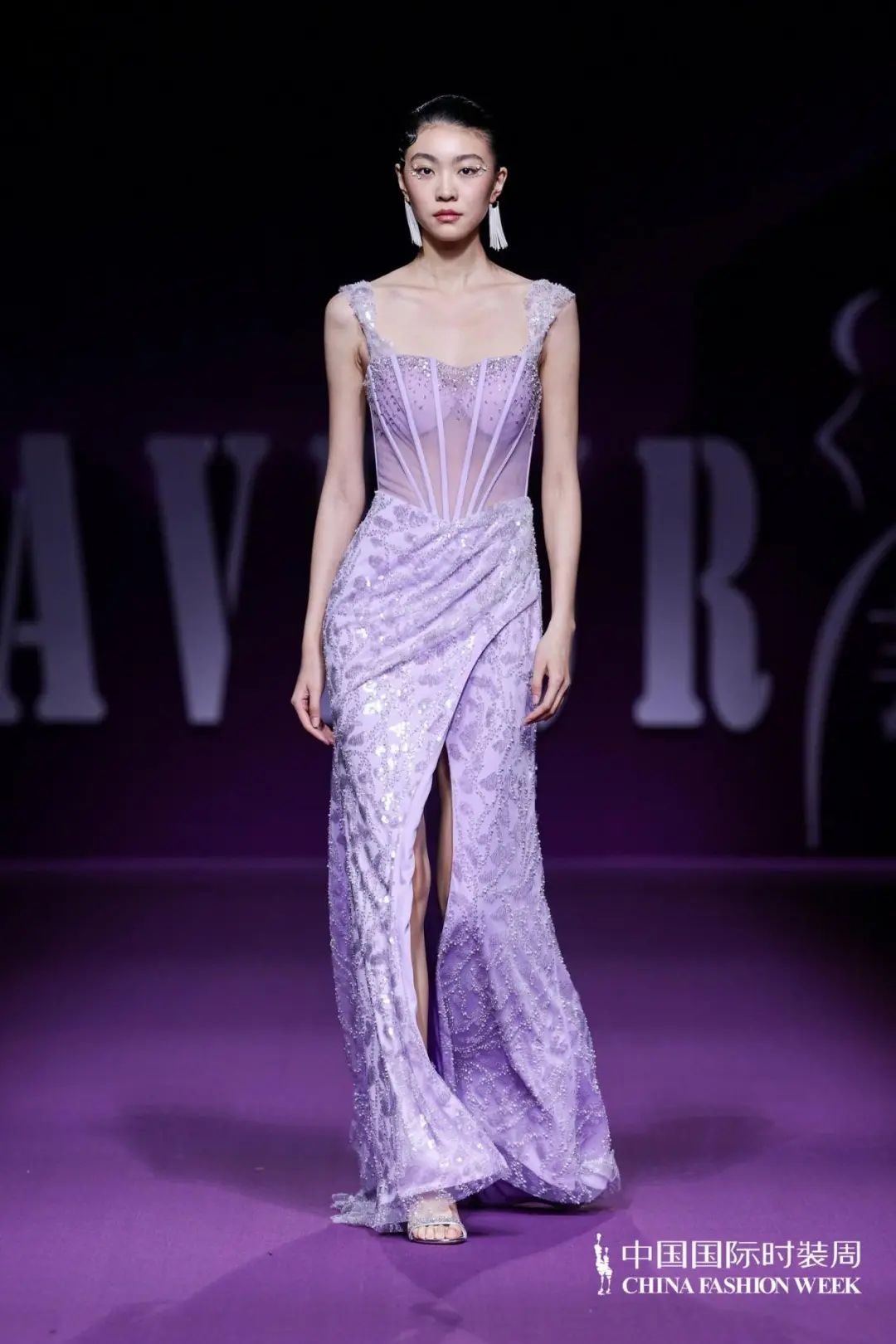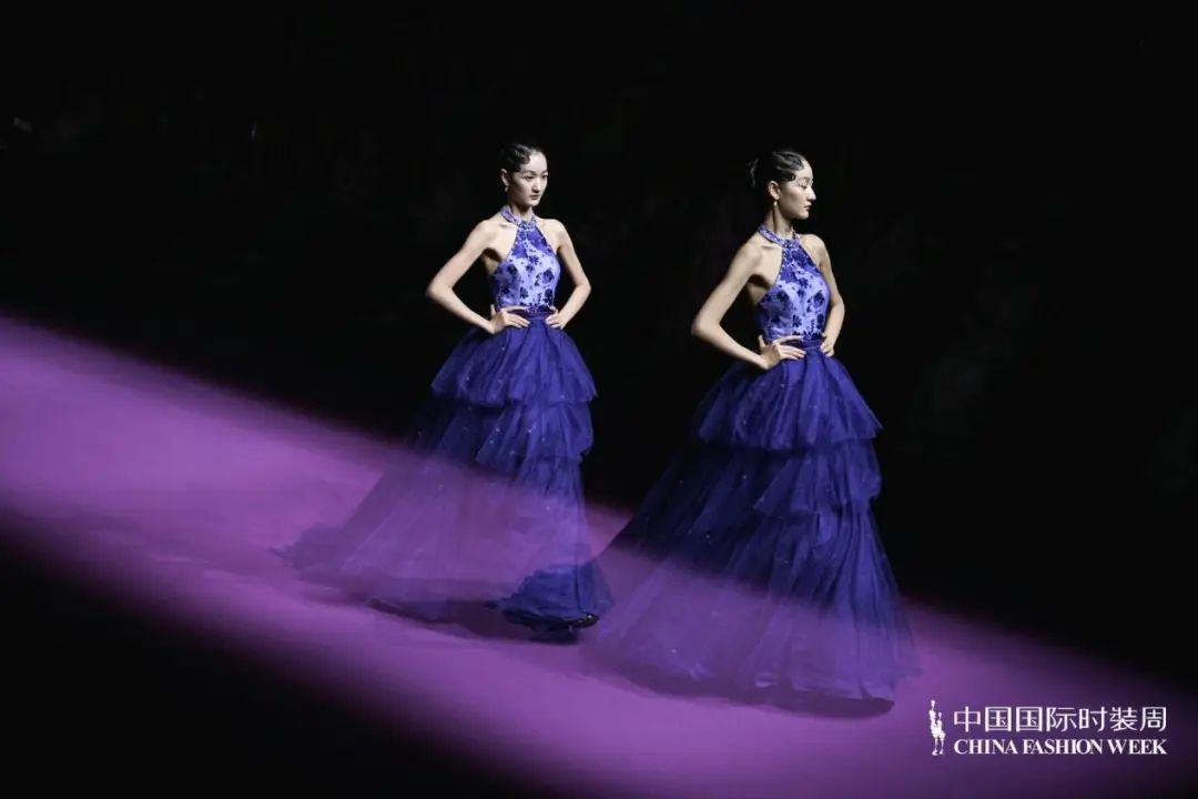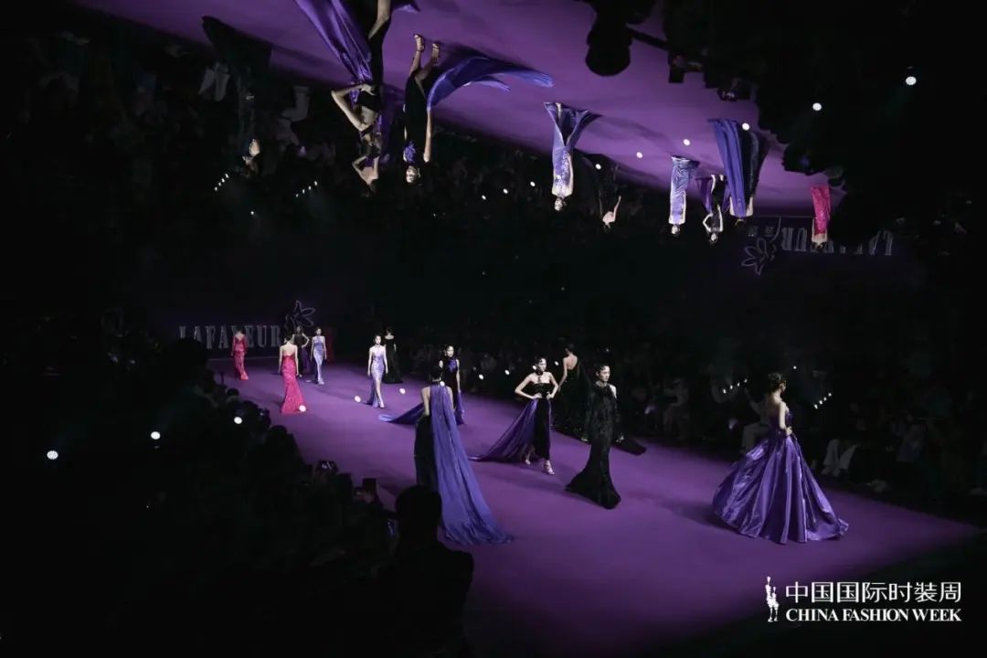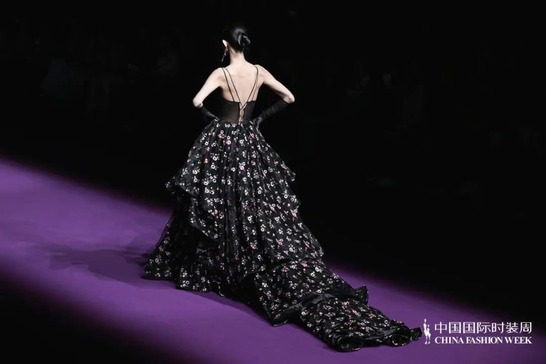 散發(fā)迷人的新浪漫主義氣息「輕奢時尚禮服」系列,以浪漫和優(yōu)雅為設(shè)計(jì)框架,用羽毛,流蘇,寶石、編結(jié),勾勒出精致的細(xì)節(jié)。透明薄紗、絲綢、雪紡等多材質(zhì)隨心拼接;廣繡、潮繡、苗繡、珠繡等獨(dú)特鉤針妙藝如藝術(shù)品般栩栩如生;從絳紫色、玫紅色到黑色層層遞進(jìn),鑲嵌著珍珠、水晶、鉆石,在秀場的燈光中,仿佛回到絢爛的黃金年代,也預(yù)示著擁有不斷重塑自我、重塑時尚精神的LAFAVEUR蕓想如同「浴火鳳凰」,強(qiáng)調(diào)當(dāng)代女性如何在優(yōu)雅與堅(jiān)韌之間找到平衡,展現(xiàn)內(nèi)外兼修的豐盛之美。