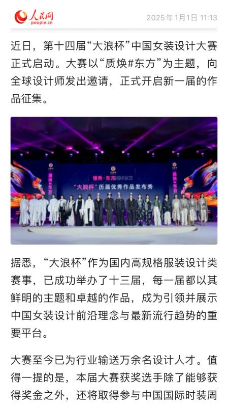 細節(jié)見真章,匠心蘊久長。已成功舉辦十四屆的“大浪杯”中國女裝設計大賽,匯聚全球上萬名設計師推動東方藝術文化創(chuàng)新傳播。他們以技法革新對接市場需求,以文化自信詮釋當代審美,讓傳統(tǒng)美學在時裝領域綻放時代華彩。