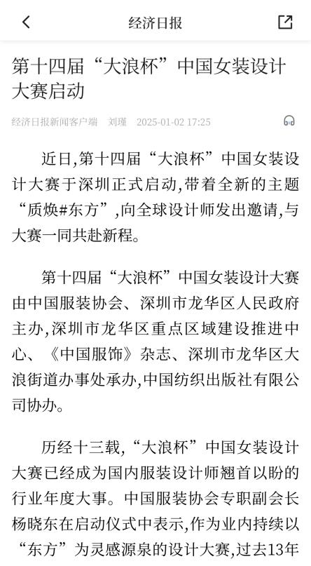 ![]() “本屆大賽主題契合產業(yè)新質生產力發(fā)展方向,大量作品構思強調了東方時尚元素與科技應用的結合。”中國服裝協(xié)會專職副會長楊曉東表示,參賽作品注重挖掘中國傳統(tǒng)元素,并在材質和AI技術應用上有所創(chuàng)新,體現(xiàn)了設計與產業(yè)的深度聯(lián)動。“大浪杯”連續(xù)舉辦十四年,顯著提升了中國年輕設計師水平,促進了行業(yè)人才培養(yǎng),尤其在推動中國服裝產業(yè)的創(chuàng)新力和可持續(xù)發(fā)展方面發(fā)揮了積極作用。