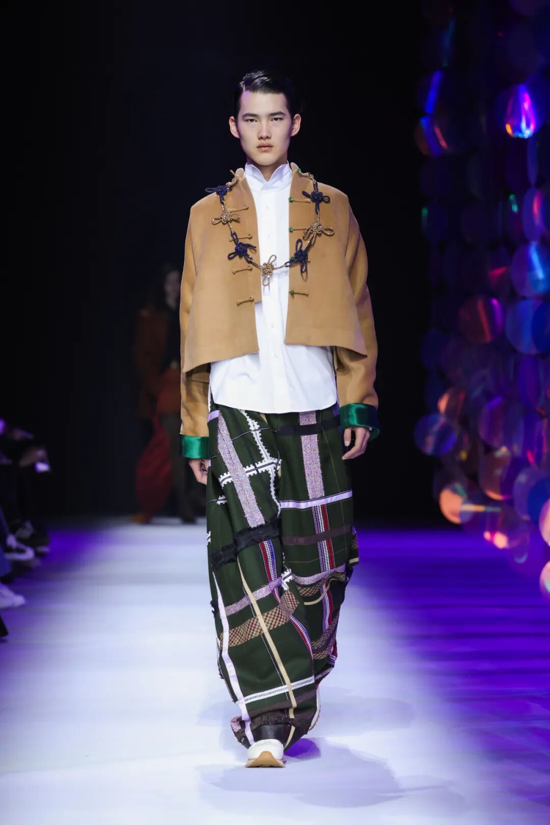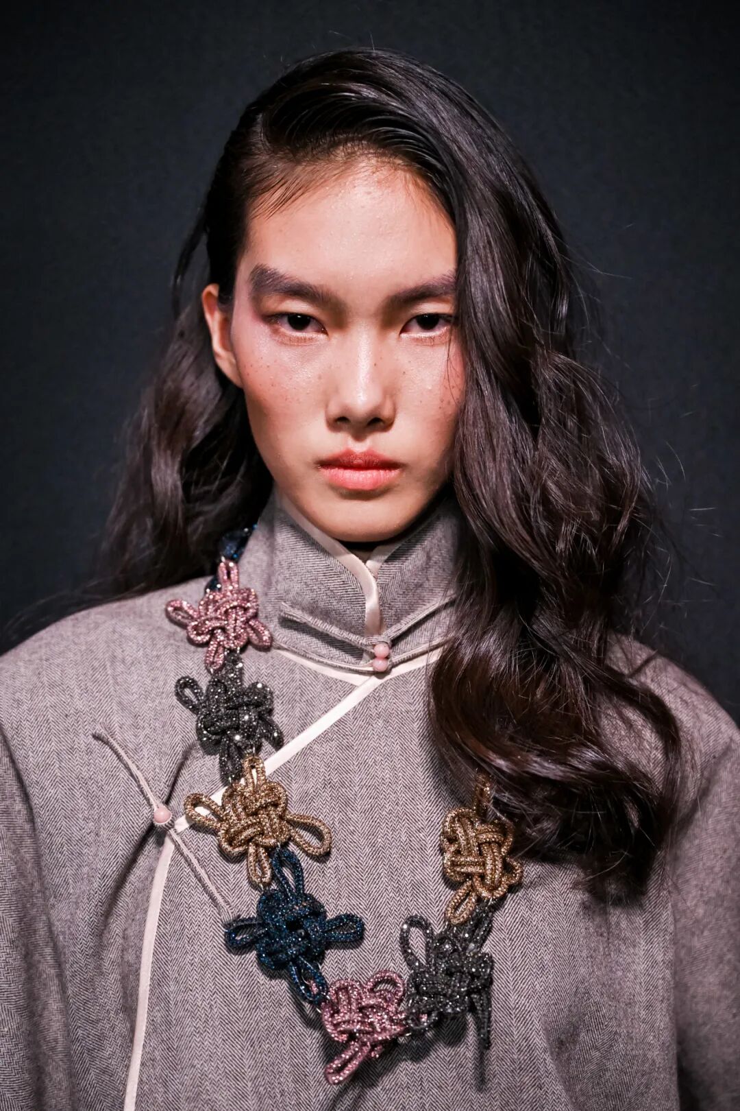 色彩運用平衡,琥珀/杏仁/暖金/棕灰搭配米白/花粉紫/秋香綠/玫粉,呈現祥和氛圍。服裝結構強調上下身長比例,利用中式剪裁的獨特工藝創造服裝的空間感,廓形的多樣化風貌是本季的流行熱點,斜裁編織,不同材質拼接,呈現不拘一格的時髦風貌。