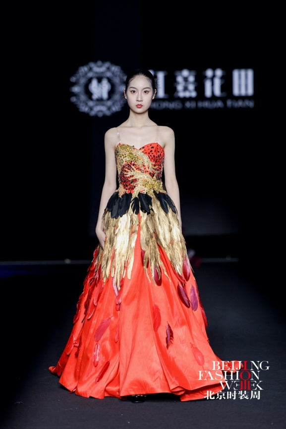 ![]() ![]() ![]() ![]() ![]() ![]() ![]() 熾焰花宴系列將設(shè)計視角轉(zhuǎn)向夕陽映照下的花田景象。濃烈色彩與光影交織,花朵在熾熱氛圍中盛放。設(shè)計以戲劇化結(jié)構(gòu)與舞臺張力為核心,通過夸張裙擺、不對稱結(jié)構(gòu)與立體裝飾形成強烈視覺沖擊。深紅、黑色與金色的大膽對比,結(jié)合羽毛裝飾與光澤面料,展現(xiàn)女性自信而堅定的力量之美。