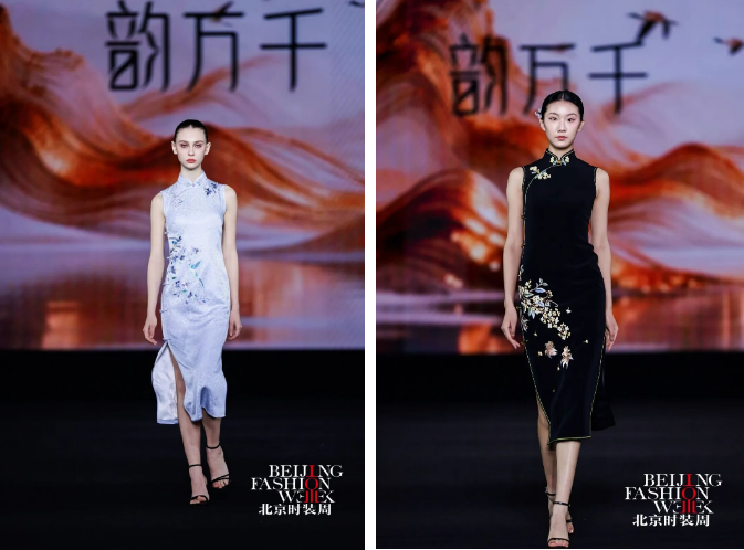 讓非遺走入日常,本屆時(shí)裝周上的另一條路徑也值得關(guān)注。絲路麗人&時(shí)見遠(yuǎn)婷的“方·寸”系列,打破傳統(tǒng)旗袍的單一剪裁思路,創(chuàng)新使用彈力針織面料,結(jié)合立體裁剪,讓旗袍從儀式感服飾走向日常適穿性。而嘉合藝秀的“韻界”系列也以“傳統(tǒng)肌理與現(xiàn)代廓形共生”為理念,既保留非遺工藝的匠心溫度,又契合“質(zhì)感松弛”的時(shí)尚趨勢(shì),打破傳統(tǒng)與現(xiàn)代的二元對(duì)立。