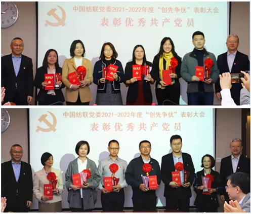 中國紡聯領導班子成員為 “優秀共產黨員”“優秀黨務工作者”“先進基層黨組織”頒獎。